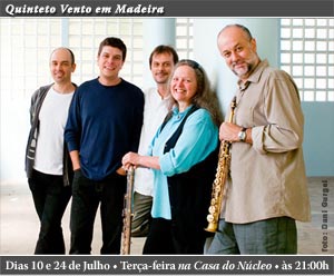 Quinteto Vento em Madeira na Casa do Núcleo "Brasiliana” é um disco de grupo. O resultado sonoro vem da prática de músicos que tocam e convivem, como explica Léa: “O Vento está no seu quarto ano e se encontra praticamente toda semana. Essa convivência aprofunda a proposta e realização musical. A idéia original fica mais redonda.” Formado por Léa Freire (flauta e flauta baixo), Teco Cardoso (sax soprano e barítono e flauta e flauta em sol), Tiago Costa (piano), Fernando Demarco (baixo acústico) e Edu Ribeiro (bateria), o Vento em Madeira traz música popular com elementos de música erudita. Tem improviso, mas sua forma é estruturada, elaborada. Ao mesmo tempo em que valoriza nossa tradição, vinda do século passado, aponta para um futuro em que atenção, concentração e responsabilidade são requeridas. “Brasiliana” conta com participação especial da cantora Mônica Salmaso e, segundo Edu Lobo, “tem de tudo no CD: ritmos variados, harmonias novas e, sobretudo, um rosto, um gosto e um aroma de Brasil o tempo inteiro. (...) esse vento vai invadir os corações de pessoas que adoram a música verdadeira. E de lá, desses corações, não saem nunca mais”. Jazz & Blues Cidade Jazz & Blues - Guaramiranga CE 17hs - Ensaio Aberto: Quinteto Vento em Madeira 21:30h - Show: Quinteto Vento em Madeira com participação especial de Mônica Salmaso www.jazzeblues.com.br Convite Virtual