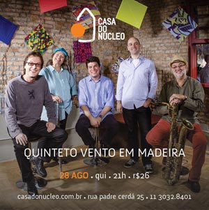 Dia 20 de Novembro - Quinta-feira às 21h Quinteto Vento em Madeira na Casa do Núcleo O Quinteto Vento em Madeira se apresenta, este ano, às quintas-feiras trazendo o belo repertório do recém-lançado álbum Brasiliana. Formado por Léa Freire (flauta e flauta baixo), Teco Cardoso (sax soprano e barítono e flauta e flauta em sol), Tiago Costa (piano), Fernando Demarco (baixo acústico) e Edu Ribeiro (bateria), o Vento em Madeira traz música popular com elementos de música erudita. Tem improviso, mas sua forma é estruturada e elaborada. Ao mesmo tempo em que valoriza nossa tradição, vinda do século passado, aponta para um futuro em que atenção, concentração e responsabilidade são requeridas. Casa do Núcleo Rua Padre Cerda, 25 Alto de Pinheiros - São Paulo SP Infos e Reservas: [11] 3032 8401 - 3815 9714 www.casadonucleo.com.br Couvert: R$ 26 Convite Virtual